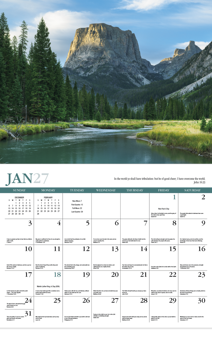 Find serenity with this religious calendar that combines King James Bible verses with inspirational scenic images. The FSC® label means that the materials used for this product come from well-managed FSC®-certified forests and other controlled sources.