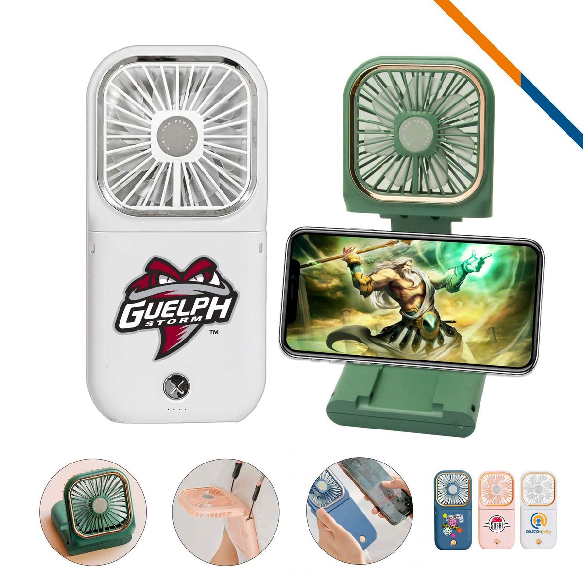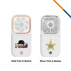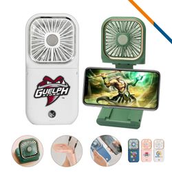 Exclusive all in one power fan stand features with 3 speeds control, 180 degree folding and flip design, 3000mAh built-in battery. Unique built-in phone holder design, you can use as phone stand to put it on the desk, and adjust to any direction you need. 3000 mAH rechargeable lithium battery can use 4-6 hours without recharge, it can use it as power bank to charge your phone. Hand free design allow you to wear around you neck and enjoy the wind. Large imprint area great for full color or spot color imprint. Gold trim & button version and silver trim & button version are available for you to choose.